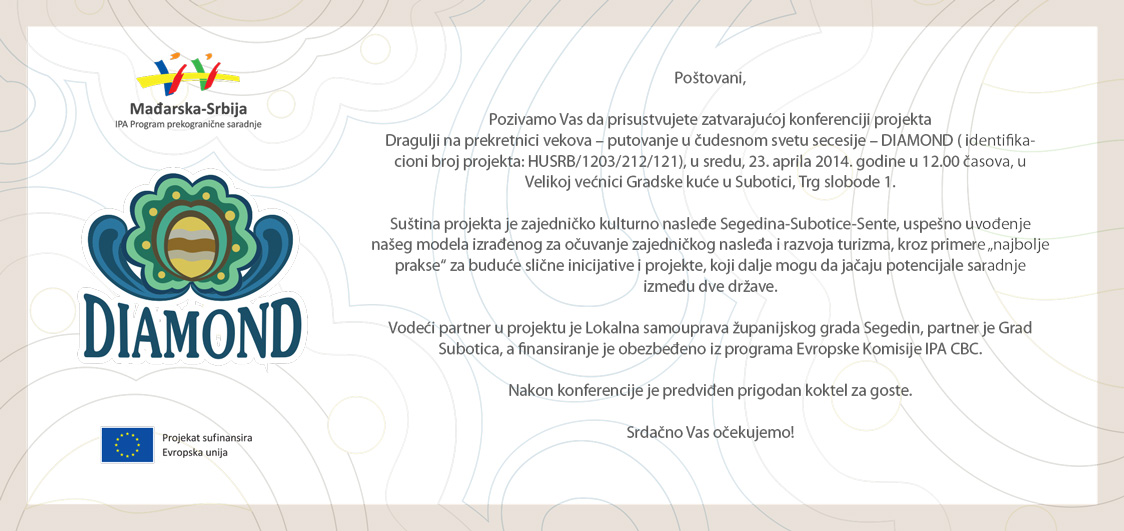 Završna konferencija projekta, održana je 23. aprila 2014. godine u Subotici, koju su svečano otvorili Jene Maglai, gradonačelnik Subotice i dr Laslo Šoljmoš, zamenik gradonačelnika Segedina. Na konferenciji su predstavljeni rezultati projekta. Prisutnima su predstavljeni monografija o Ferencu Rajhlu, knjiga „Dragulji na prekretnici vekova” i kratak PR film o toku realizacije projekta, koji su izrađeni u okviru projekta.